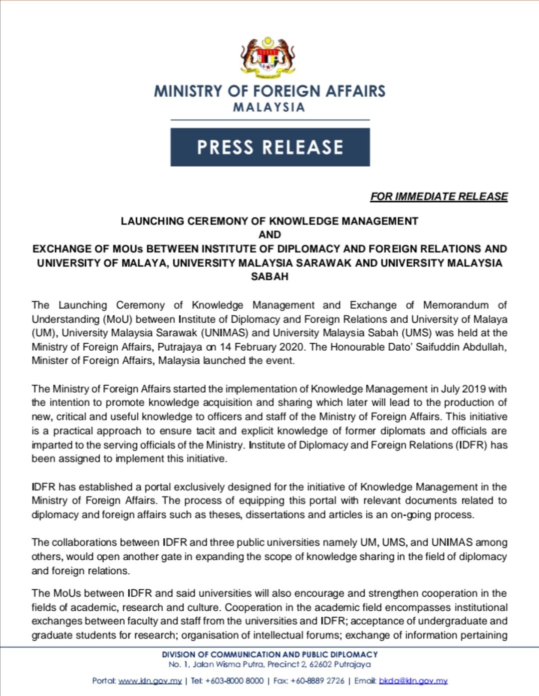 Wisma Putra Na Twitteru Press Release Fm Dato Saifuddinabd Launched The Ministry S Knowledge Management Ceremony Earlier Today To Kick Start The Knowledge Sharing Collaboration Between Idfrmalaysia 3 Public Universities Namely Unimalaya